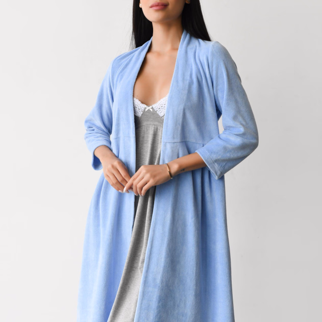 Ніжний халат у блакитному кольорі створений для комфорту майбутніх та годуючих матусь. М’який бавовняний велюр дарує тепло й приємні відчуття, а крій на запах із поясом робить модель практичною та універсальною.